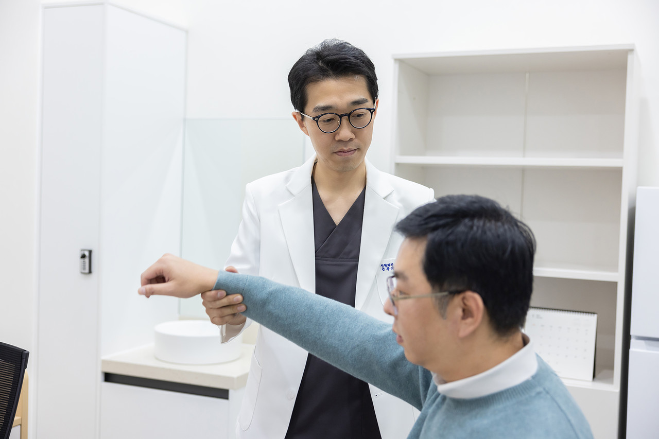 회전근개 질환의 치료는 환자의 나이, 직업, 필요한 기능 정도, 파열의 크기, 기능 저하의 정도, 손상 기전, 통증의 정도 등을 감안하여 결정합니다. 먼저 힘줄의 파열이 부분적으로 있는 경우에는 비수술적 치료를 먼저 시행합니다. 반면 힘줄의 전체두께가 파열된 전층 파열의 경우 일반적으로 수술적 치료를 시행합니다. 또한 활동이 많을 것으로 예상되는 젊은 연령의 환자, 강한 외력에 의한 외상성 파열이라고 생각되는 경우, 심각한 기능 이상 및 근력의 저하를 동반한 경우 등에서도 수술을 고려하는 것이 일반적입니다.