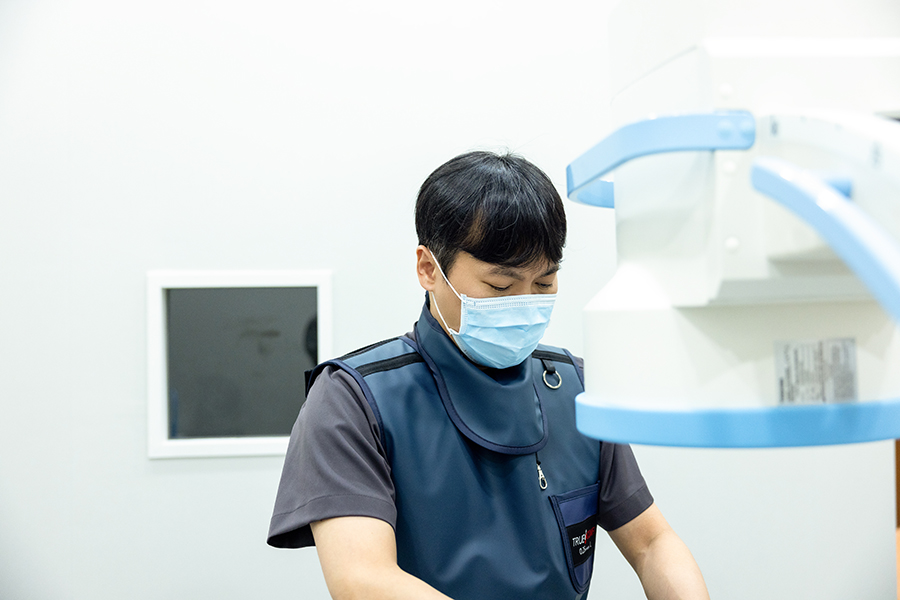 방사선 검사는 우선 단순 방사선 검사를 시행합니다. 단순 방사선 검사에서 정상 요추 만곡의 감소 외에는 추간판 탈출증을 진단할 만한 특이 소견은 없지만 다른 진단을 감별하기 위해 꼭 필요한 검사입니다.